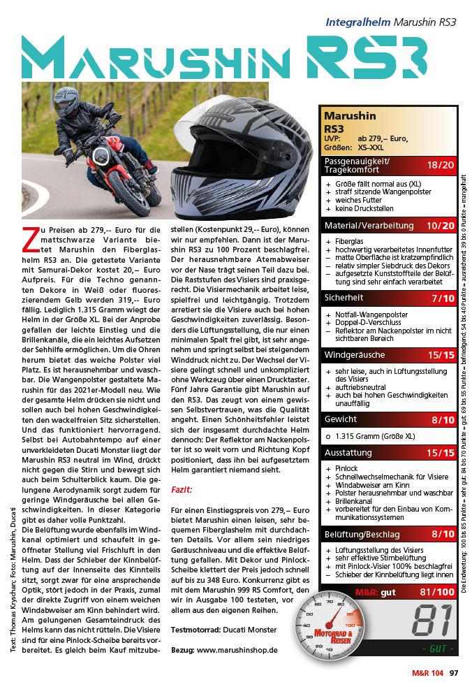 Neu im Marushin Sortiment und wird sofort zum Klassiker, welcher von Sportfahrern und der Fachpresse gleichermaßen gelobt wird. Beim RS3 verzichtet Marushin ganz bewusst auf Spielereien sowie unnötige Features und konzentriert sich dagegen voll auf das Wesentliche beim Motorradfahren. Der superleichte RS3 ist alles was sportliche Motorradfahrer brauchen um ihr Hobby zu genießen.